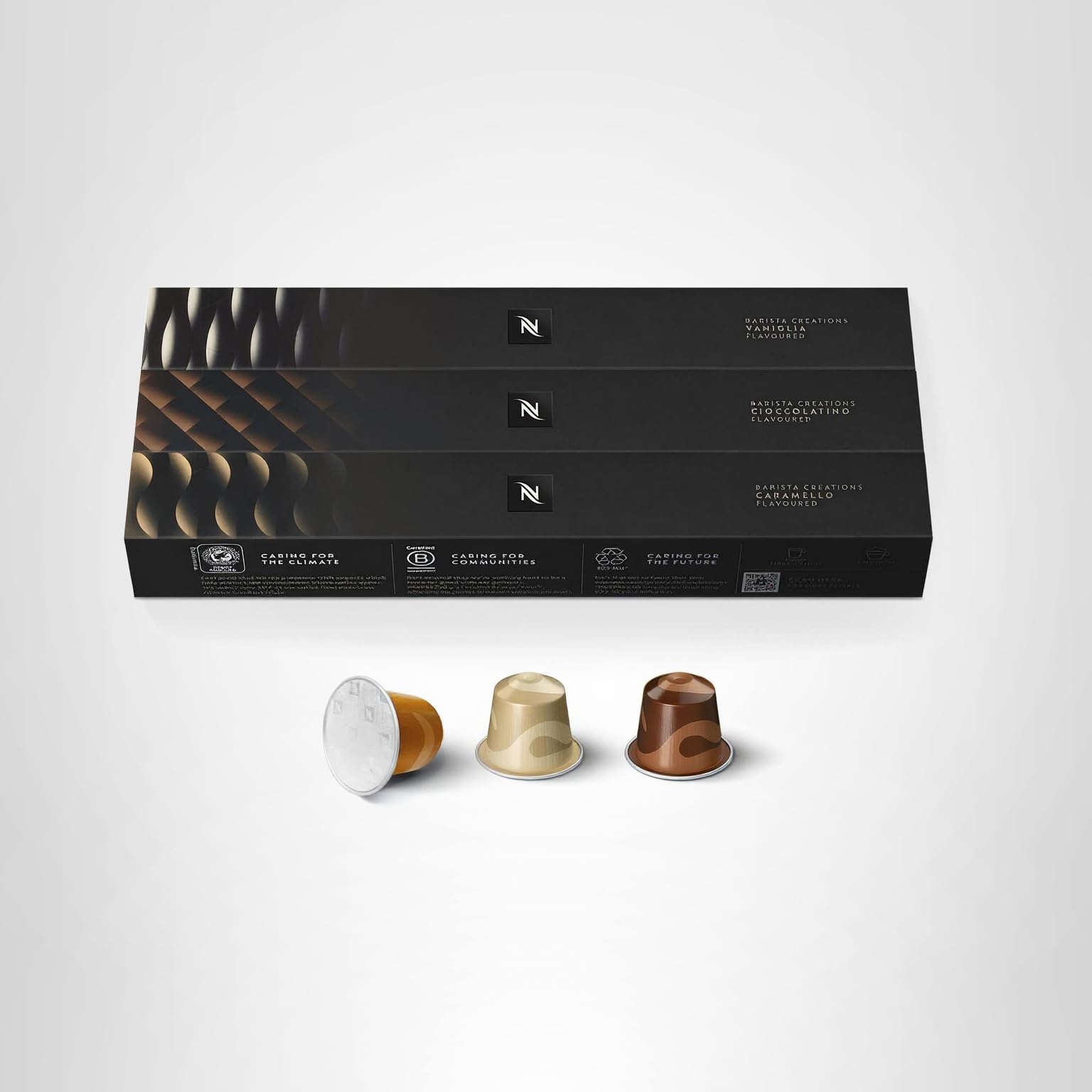 - INDULGENT FLAVORS: This assortment of Nespresso Vertuo coffee pods contains a variety of Nespresso capsules: 10 Caramello, 10 Cioccolato , 10 Vaniglia